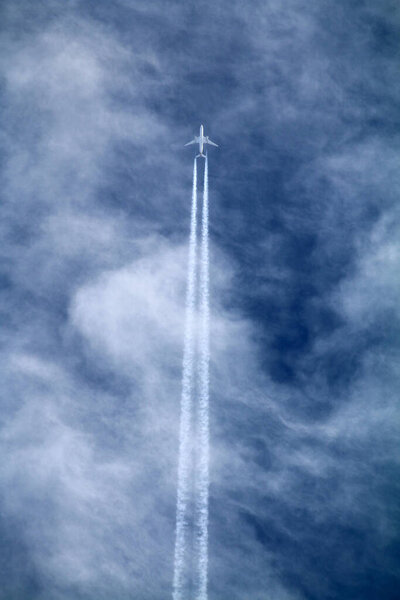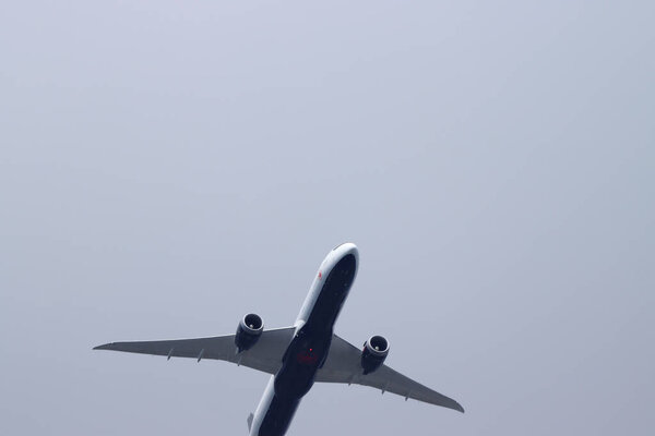578554798 The view of the flying plane against the grayish-blue sky. Mississauga, Canada.