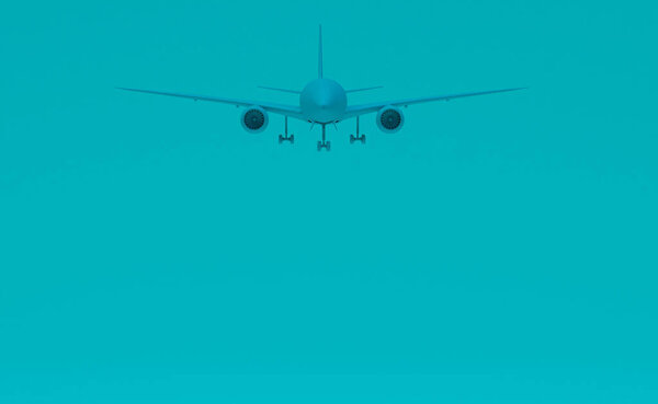 579431444 A 3d rendering illustration of an airplane in flight on blue copy space as a sky
