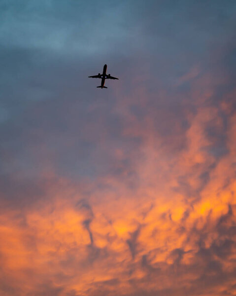 579492768 A vertical low angle shot of an airplane in a dramatic sky with colorful clouds