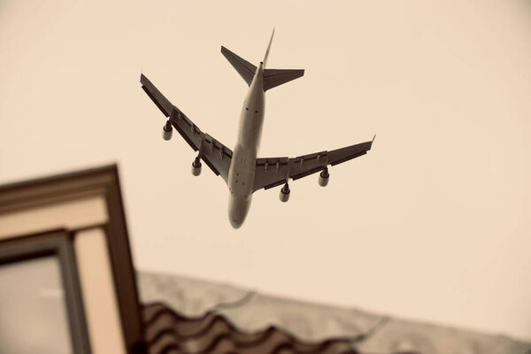 579799104 A low angle view of an airplane flying in the sky on a blurred background
