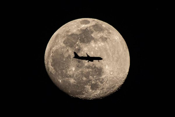 588360210 A scenic view of the silhouette of an airplane on the background of a beautiful big full moon