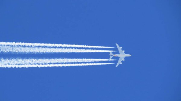 595356134 A low-angle shot of a jet plane and the smoke coming out of it against a clear blue sky