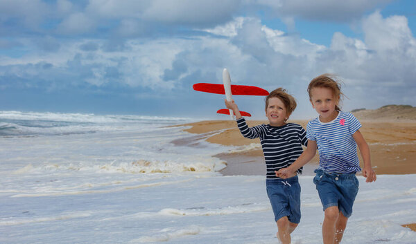 854132558 Two kids, excited, run along the beach, with waves lapping at their feet and one of them holding a red aircraft toy beneath an overcast sky