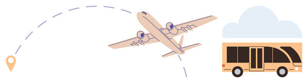 844485212 Airplane flying with dotted trajectory towards a destination marker and a bus parked near a cloud. Ideal for travel, transportation, logistics, planning, tourism, journey, connection. Simple flat