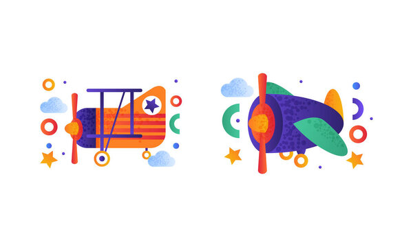 489957792 Cute Air Vehicles Set, Toy Retro Airplanes Transport Flat Vector Illustration Isolated on White Background.