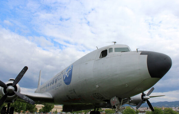 814512240 Plane performing mosquito control over Osijek city rooftops by releasing chemical fog. Environmental pollution and health safety concerns.