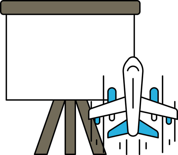 857642434 A black and white drawing of an airplane flying over a projector screen. The airplane is positioned in the middle of the image, with the projector screen behind it. Concept of motion and excitement