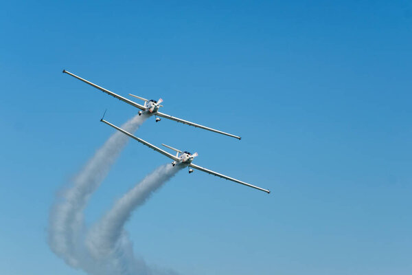 757319276 Stunt aerobatic plane performing stunts in blue sky with smoke trail. Concept of teamwork, collaboration, coordination, trust, precision, difficulty, challenge, speed, synergy
