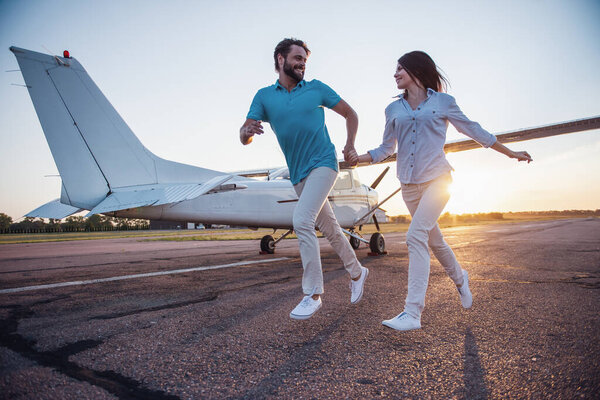 689877276 Beautiful romantic couple is holding hands, looking at each other and smiling while running on take-off ground near the aircraft
