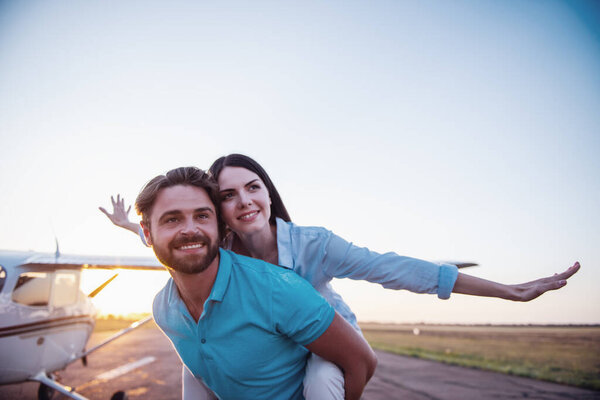 689877286 Beautiful romantic couple is looking away and smiling while standing on take-off ground near the aircraft, girl is piggyback