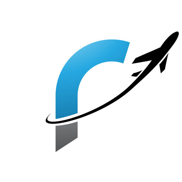 679012642 Blue and Black Lowercase Letter R Icon with an Airplane on a White Background