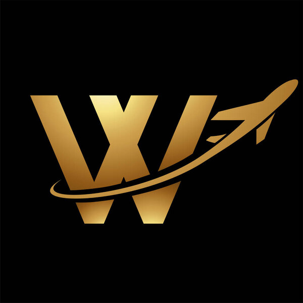 679014932 Glossy Gold Lowercase Letter W Icon with an Airplane on a Black Background