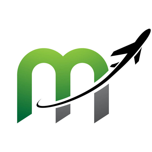 679016586 Green and Black Lowercase Letter M Icon with an Airplane on a White Background