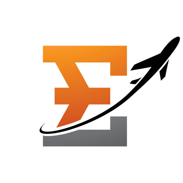 679017770 Orange and Black Antique Letter E Icon with an Airplane on a White Background