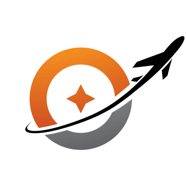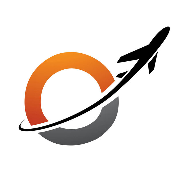 679018682 Orange and Black Uppercase Letter O Icon with an Airplane on a White Background