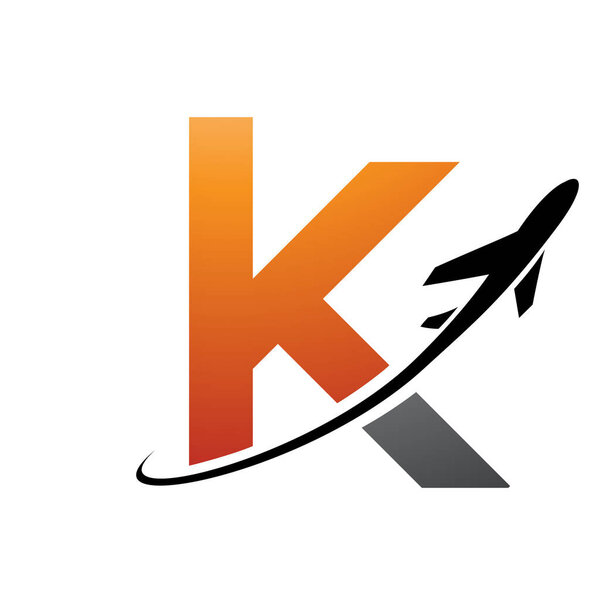 679018326 Orange and Black Lowercase Letter K Icon with an Airplane on a White Background