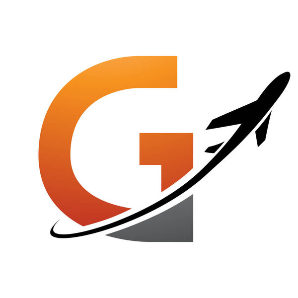 679018610 Orange and Black Uppercase Letter G Icon with an Airplane on a White Background