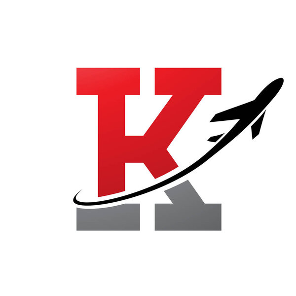 679018890 Red and Black Antique Letter K Icon with an Airplane on a White Background