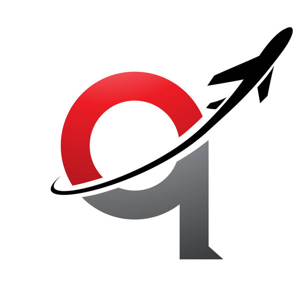 679019576 Red and Black Lowercase Letter Q Icon with an Airplane on a White Background