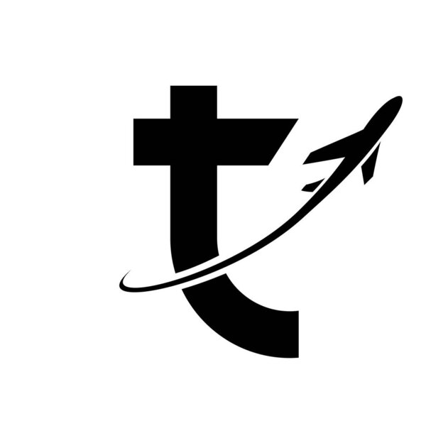 683986920 Black Lowercase Letter T Icon with an Airplane on a White Background
