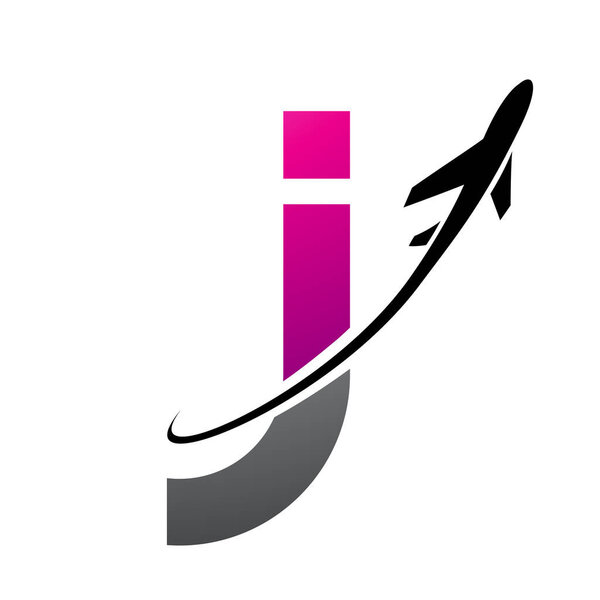 684009398 Magenta and Black Lowercase Letter J Icon with an Airplane on a White Background