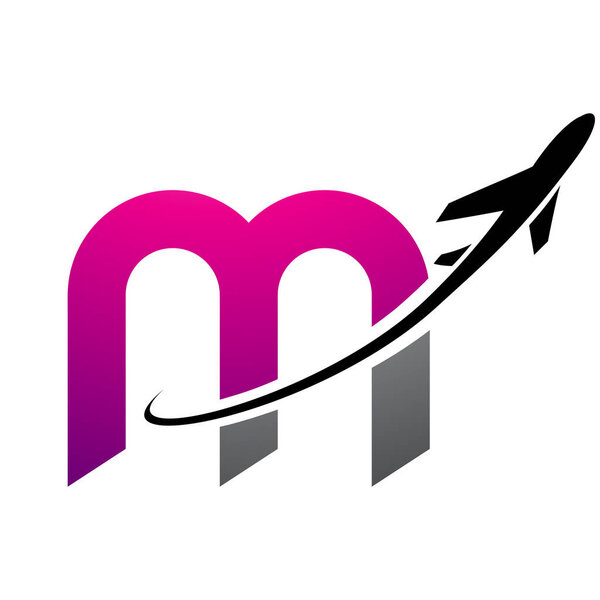 684009596 Magenta and Black Lowercase Letter M Icon with an Airplane on a White Background