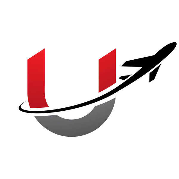 684029888 Red and Black Lowercase Letter U Icon with an Airplane on a White Background