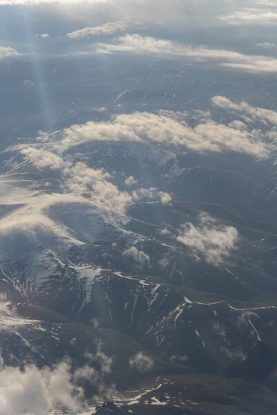 744683064 Aerial view of clouds and mountains. View from airplane window.