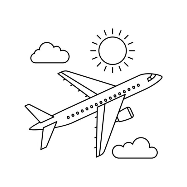 715992512 A black and white drawing of an airplane. The airplane is in the air and has a white tail