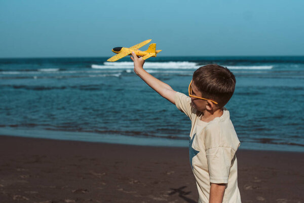 790253438 Boy playing on a sandy beach with a foam airplane.