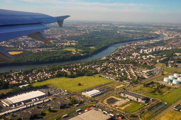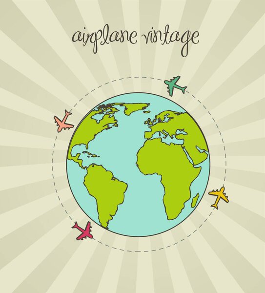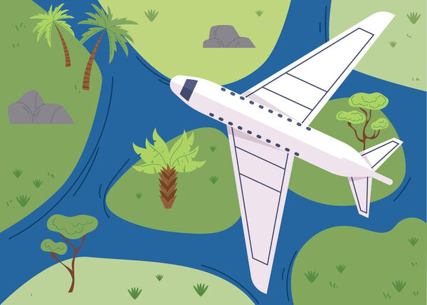686995316 Airplane fly above map landscape land field sea concept flat graphic design illustration