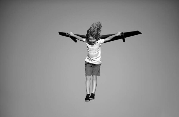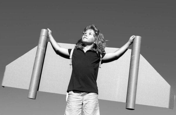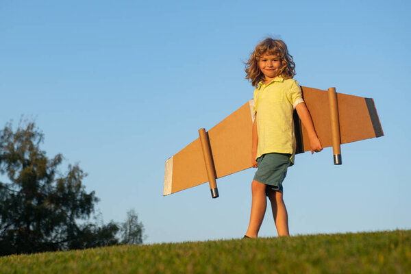 659634674 Child to be pilot. Kid with paper wings flying. Summer vacation and travel concept. Funny child boy with toy cardboard airplane wings fly on sky. Kids dreams of traveling in summer in nature
