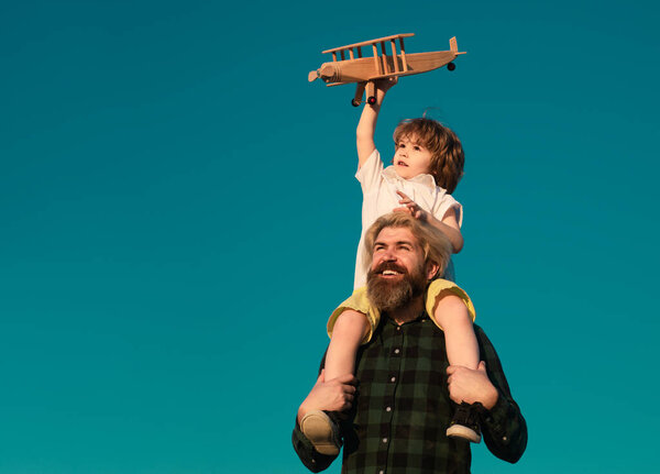 699715224 Child sits on the shoulders of his father. Kid playing imagination dream flying airplane, childrens day concept. Father and son. Parent with child boy