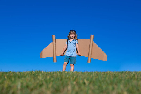 749557664 Child boy plays in an astronaut dreams of space. Happy child play with toy plane cardboard wings against blue sky. Kid having fun in summer field outdoor. Portrait of boy with paper wings