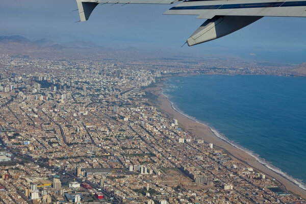 805788264 Lima stretched along the edge of the continent, carved by cliffs and kissed by the Pacific breeze. From above, its a vast mosaic of life, light, and coastline-where the desert meets the deep blue.