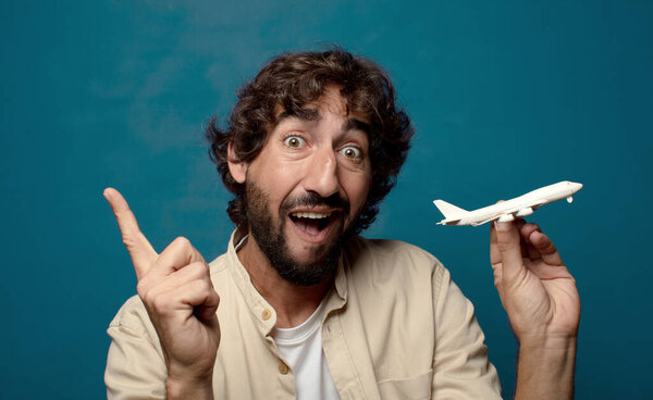 841239240 Portrait of a traveler with short wavy hair next to an airport, airplane in flight, trees, and clouds. Ideal for travel, tourism, aviation, vacation journey globalization exploration. Simple flat