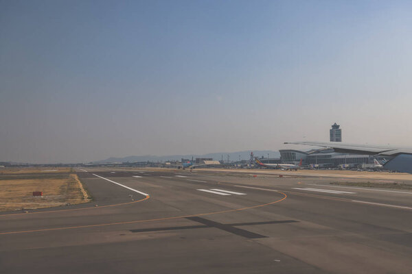 654280244 An aircraft plane landing on the Airport Runway under blue sky