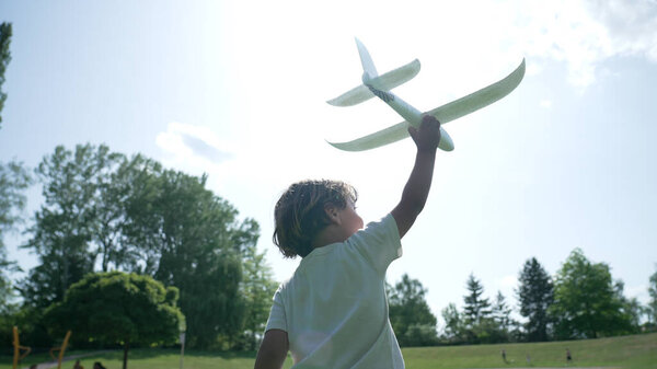 727954716 Joyful Boy Lifting Toy Glider to Sky in Park, Bright Sunny Day with Fluffy Clouds