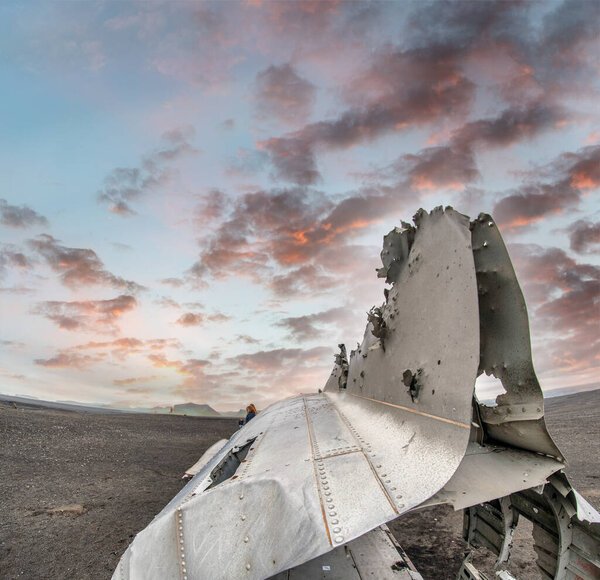 618053916 Airplane wreckage on the beach. Flight crash concept.