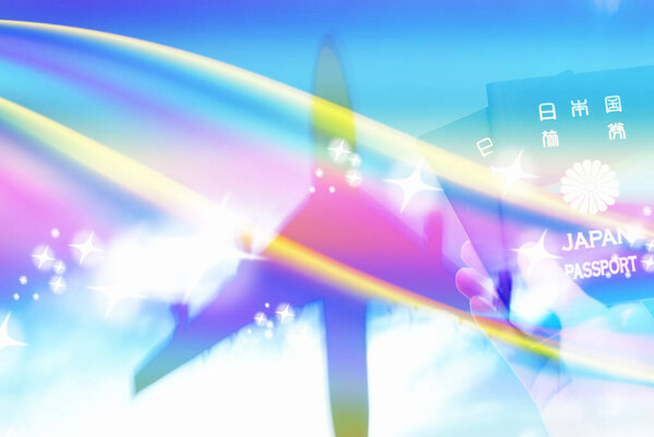 681049608 Digital Collage of an Airplane Propeller, Rainbow Trails, and a Hand Holding a Japanese Passport