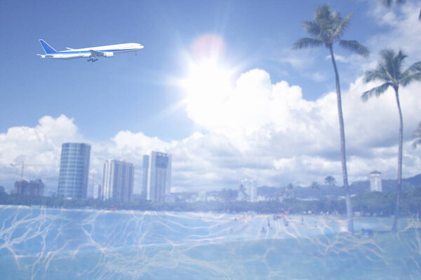 681061218 Airplane flying over sea with palm trees, buildings and clouds