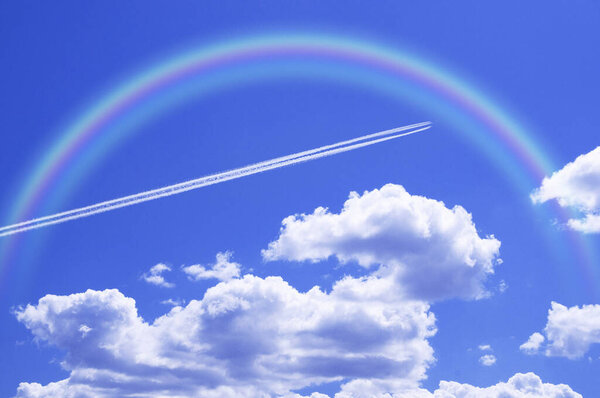 681137916 Rainbow in a blue sky with clouds and contrail from an airplane.