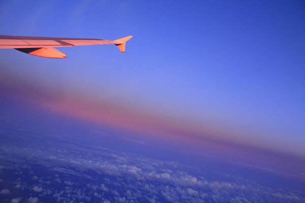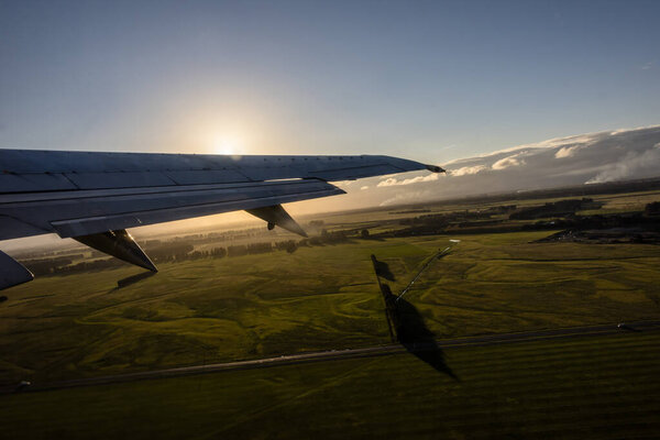 743909316 Captivating sunset view from the airplane featuring a wing silhouetted against a vibrant sky and fluffy clouds, with proximity to Niagara Falls straddling the USA and Canada