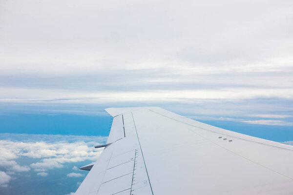 490746854 Airplane wing view above the dark clouds and sky. Inspiration concept.