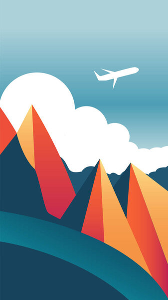 806930142 Mountain view. Postcard with a view of the mountain. Mountain peaks, flying airplane. Vacation, vacation, travel. Vector illustration, poster. Print, web design