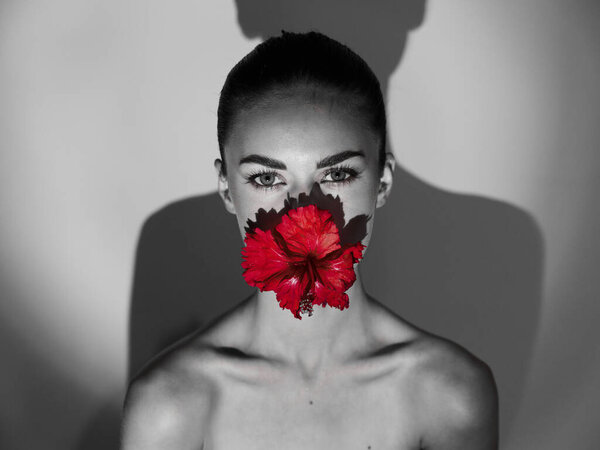 478608364 Woman naked shoulders red flower in her mouth black and white photo. High quality photo