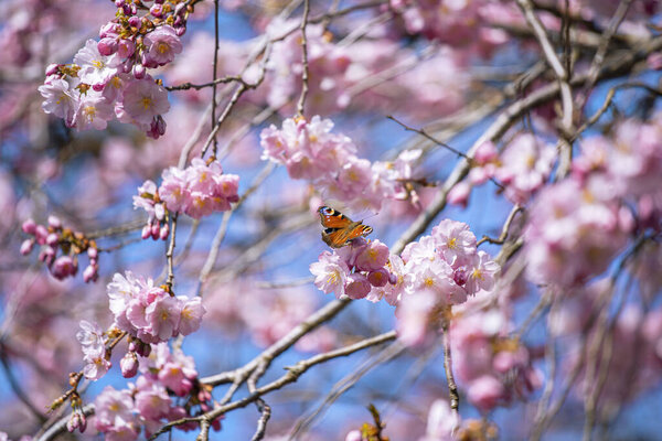 581866856 A closeup shot of sakura branches with a butterfly on a branch