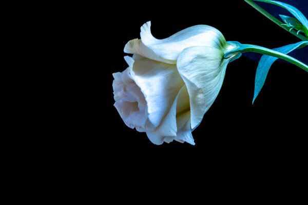 863421250 Beautiful white rose on black background