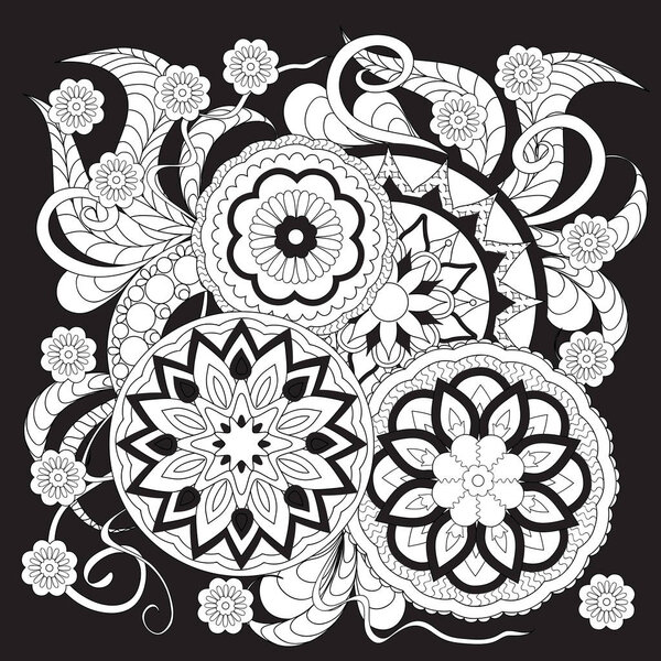 147101317 Hand drawn isolated white print on black in boho style with mandalas and flowers for backdrop visit card, decorate dishes, cup, porcelain, home, laptop skins, cases, stationery. eps 10.