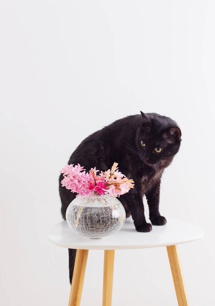 645652416 Funny black cat with pink flowers in vase on little table on white background